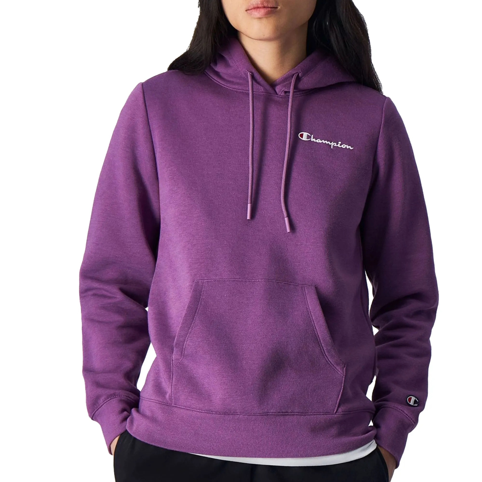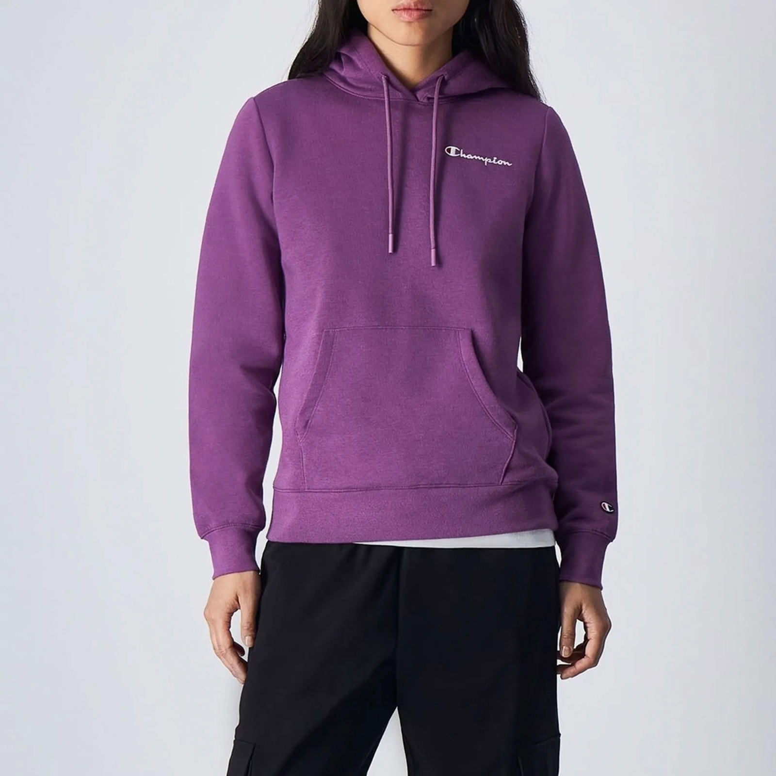 Combină acest hanorac Champion mov pentru femei cu pantaloni sport, jeans sau leggings pentru un look casual modern, perfect pentru birou, ieșiri în oraș sau antrenamente lejere.