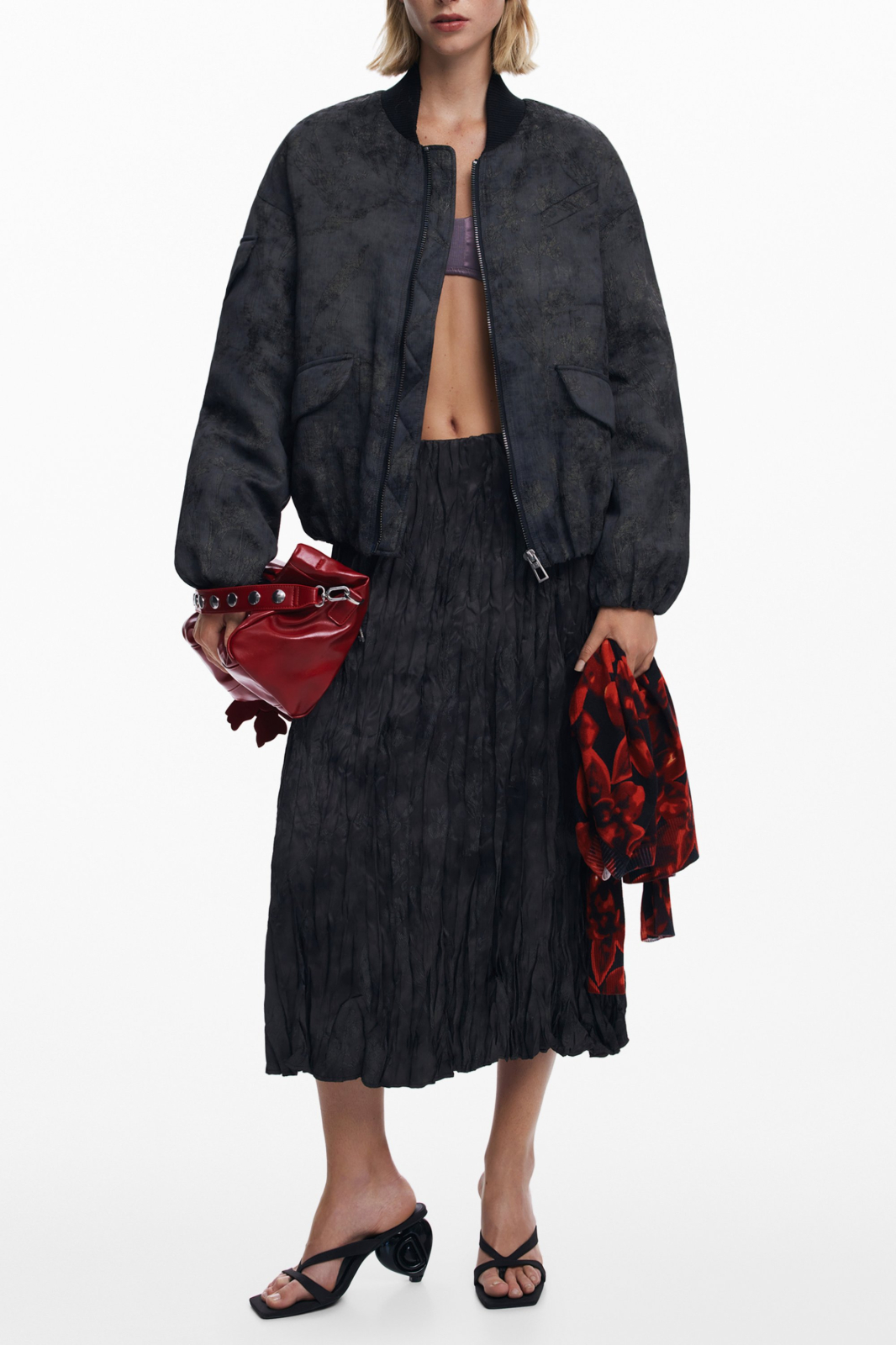 Completează-ți outfitul cu o pereche de pantaloni cargo, o fustă plisată sau chiar cu jeans casual – o alegere ideală pentru a ieși în evidență prin stil și originalitate.