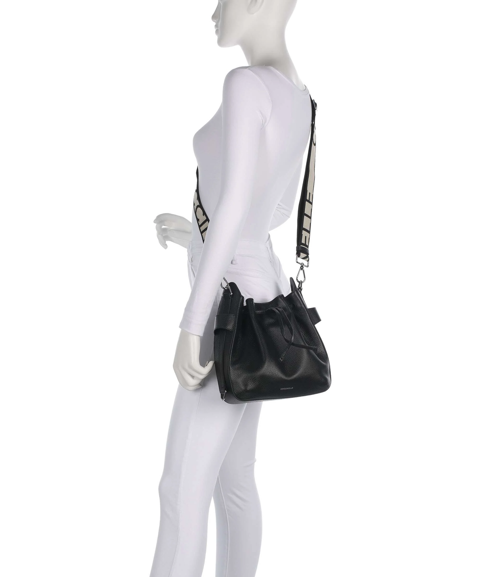 Designul este completat de închiderea practică cu șnur (drawstring), care permite acces rapid și siguranță pentru obiectele personale. Modelul este prevăzut cu curea lată ajustabilă și detașabilă cu logo, oferind confort sporit și un look contemporan.