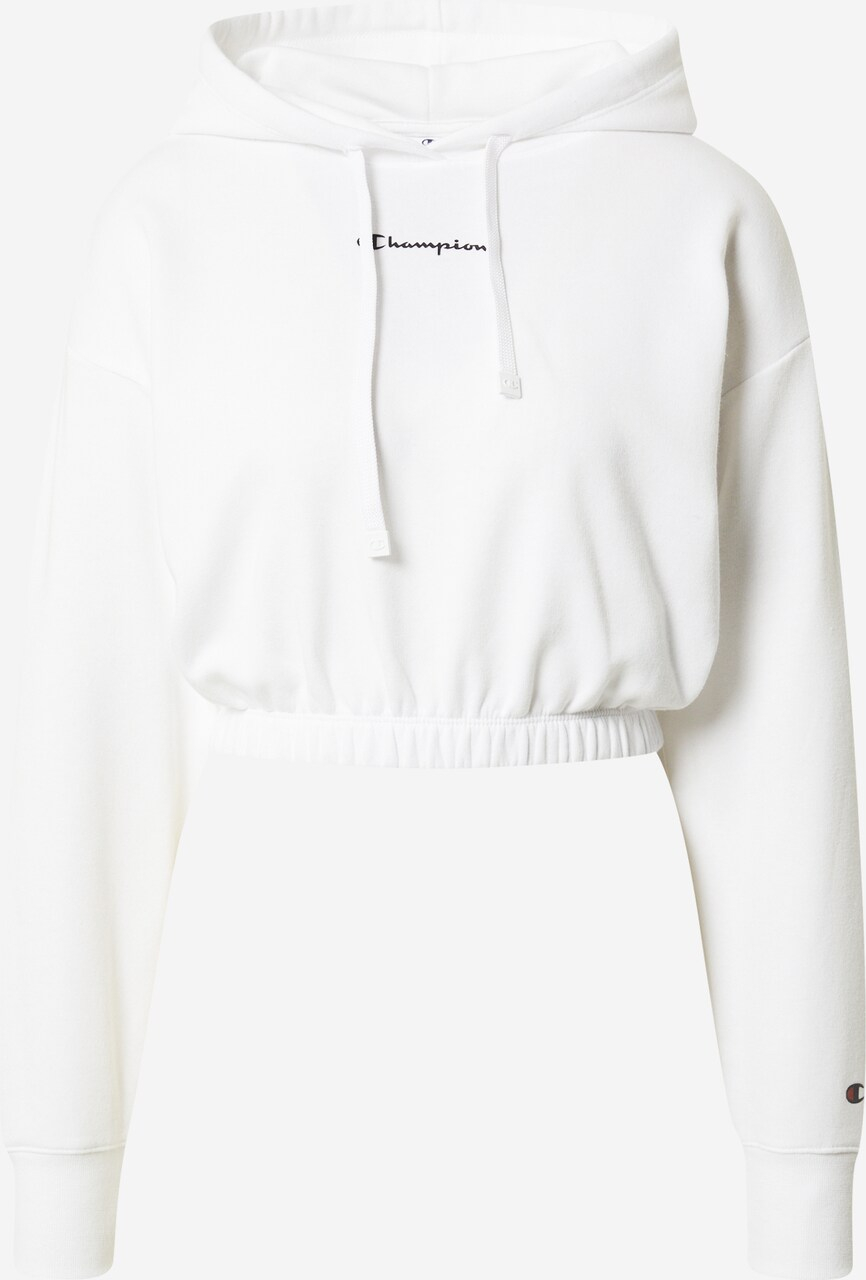 Poartă acest hanorac alb cropped Champion cu pantaloni sport, colanți sau jeans cu talie înaltă pentru un outfit urban, feminin și effortless.
