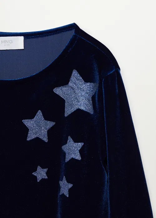 Este o rochie pentru fete, cu material catifelat și accente glitter.